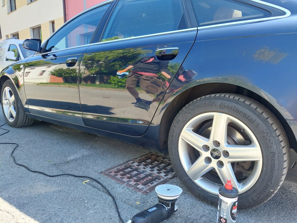 Perfektně funguje i na tvrdších lacích (např. VW, Audi, Mercedes) – stačí kombinace s beránkem nebo tvrdým červeným kotoučem a rotační leštičkou.